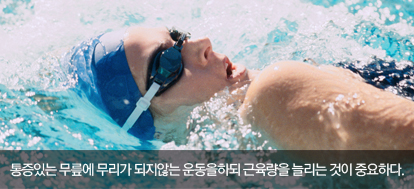 그러므로 운동을 할때는 체중이 무릎 등 관절에 실리지 않은 운동이 좋습니다, 예를 들면, 수영이나 자전거 타기이지요, 수영을 못 하는 경우에 수영장에서 걷는 것도 퇴행성 관절염에 좋은 운동입니다, 또한 누워서 다리를 펴서 올렸다 내렸다 하는 운동을 10~20회 정도씩 아침에 기상시외 자기 전에 해 보시기 바랍니다.