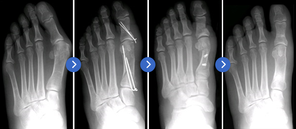 수술의 여부는 환자의 불편함 정도와 의학적 소견을 종합하여 결정하는 것이지만 가장 중요한 것은 환자가 주관적으로 느끼는 불편함의 정도이며 아무리 변형이 심하다고 해도 그것만으로 수술 여부를 결정하는 것은 아닙니다. 미용적인 측면과 단지 예쁜 구두를 신고 싶어서 수술 받기를 원하는 경우도 있는데 이러한 경우에는 수술 부위에 흉터가 남으며 수술 후에도 하이힐 등의 불편한 신발은 이후에도 증상의 재발 이나 통증이 생길 수 있음을 알고 있어야 합니다. 수술적 치료방법에는 매우 다양한 수술법이 있고 각각의 장단점이 있습니다. 환자의 나이, 변형의 심한 정도, 환자가 가장 불편하게 생각하는 부분 등을 고려하여 수술 방법을 결정하게 됩니다. 수술법은 일반적으로는 돌출 부위의 뼈를 깎아내고 외반된 중족골과 족지골을 잘라서 각을 교정하며 금속핀이나 나사못을 이용하여 고정하는 수술을 합니다. 외측 연부조직을 늘여주는 술기도 포함됩니다.
