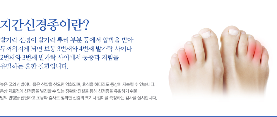 기본적으로 약물치료와 물리치료를 실시하여 치료를 진행하게 되지만, 때로는 볼이 넓고 굽이 낮은 신발을 신는 것 만으로도 효과를 보는 경우도 있습니다.이러한 치료에도 효과가 미미할 경우 신경주변에 염증을 제어하는 주사요법을 실시하게 호전이 없을 경우 수술적 치료로 신경종을 제거 증세를호전 시킬 수 있습니다.