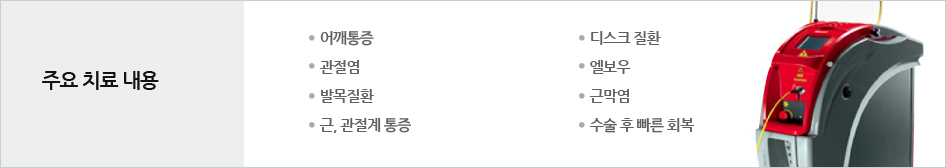 힐트레이저는 수면 부족을 가져오는 심각한 통증, 오랜 치료에도 지속 되는 급 만성의 근골격계 통증 질환들, 기존 통증 치료 방법으로 충분한 효과가 나타나지 않는 질환을 위한 간편한 비수술적 치료방법입니다.