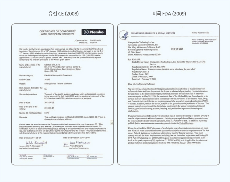 - 유럽 (CE2008). 미국 FDA(2009). 한국FDA(2011) 승인 완료